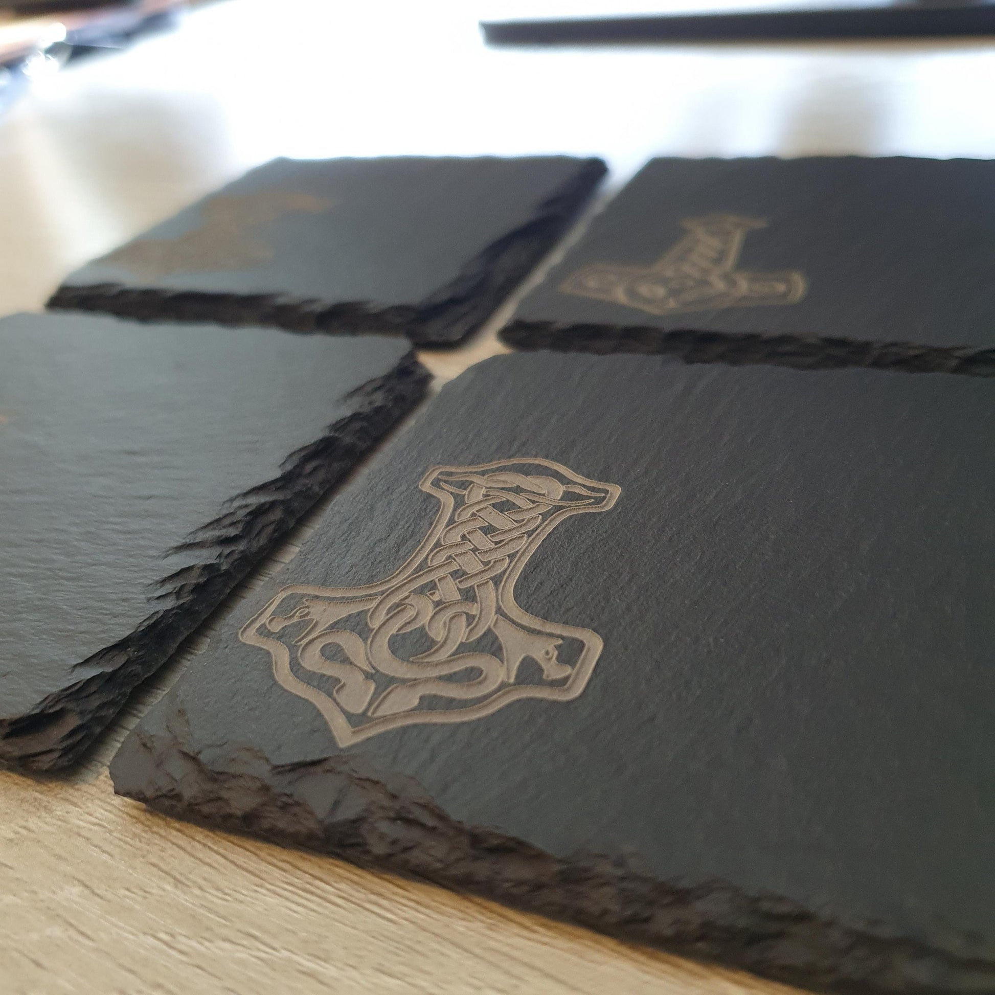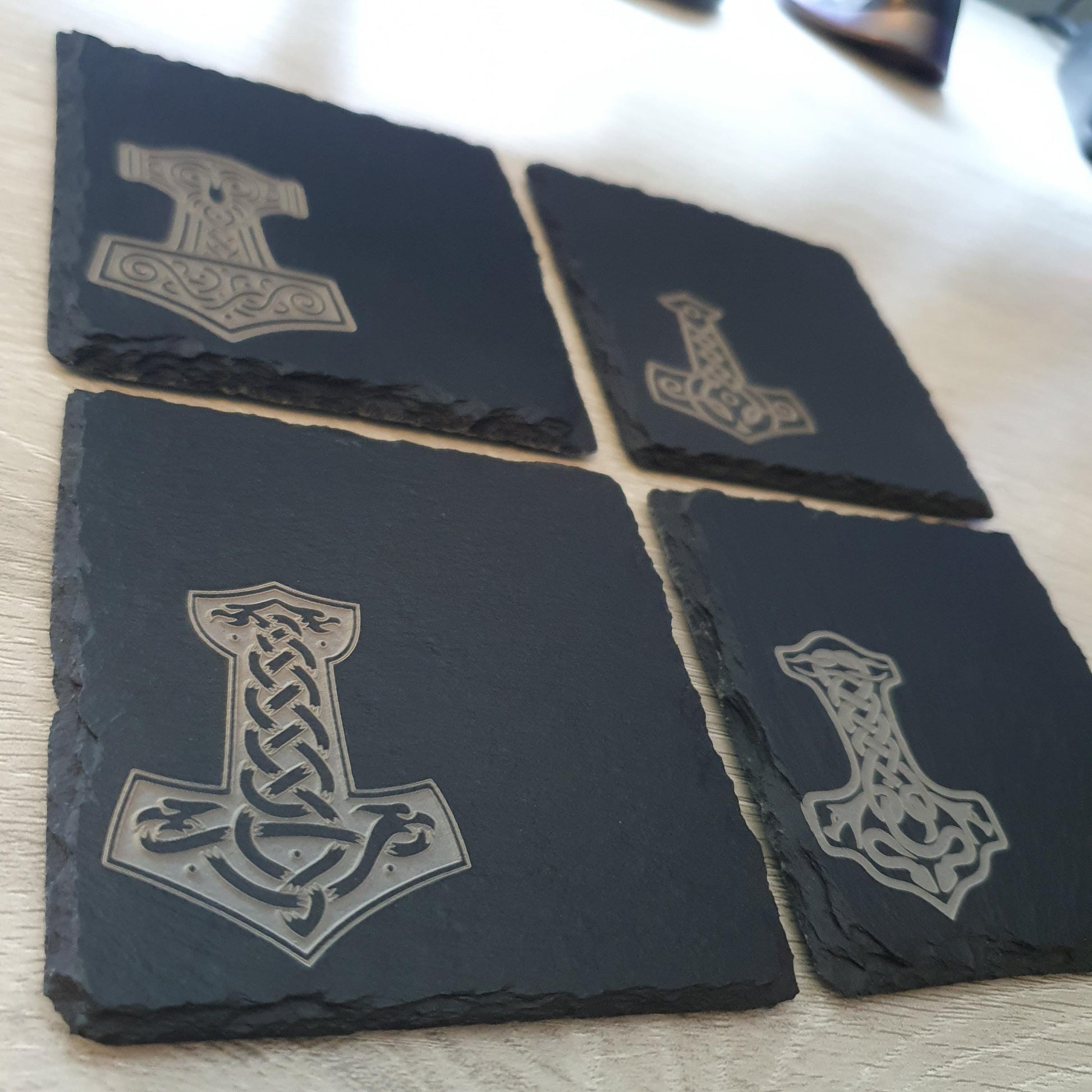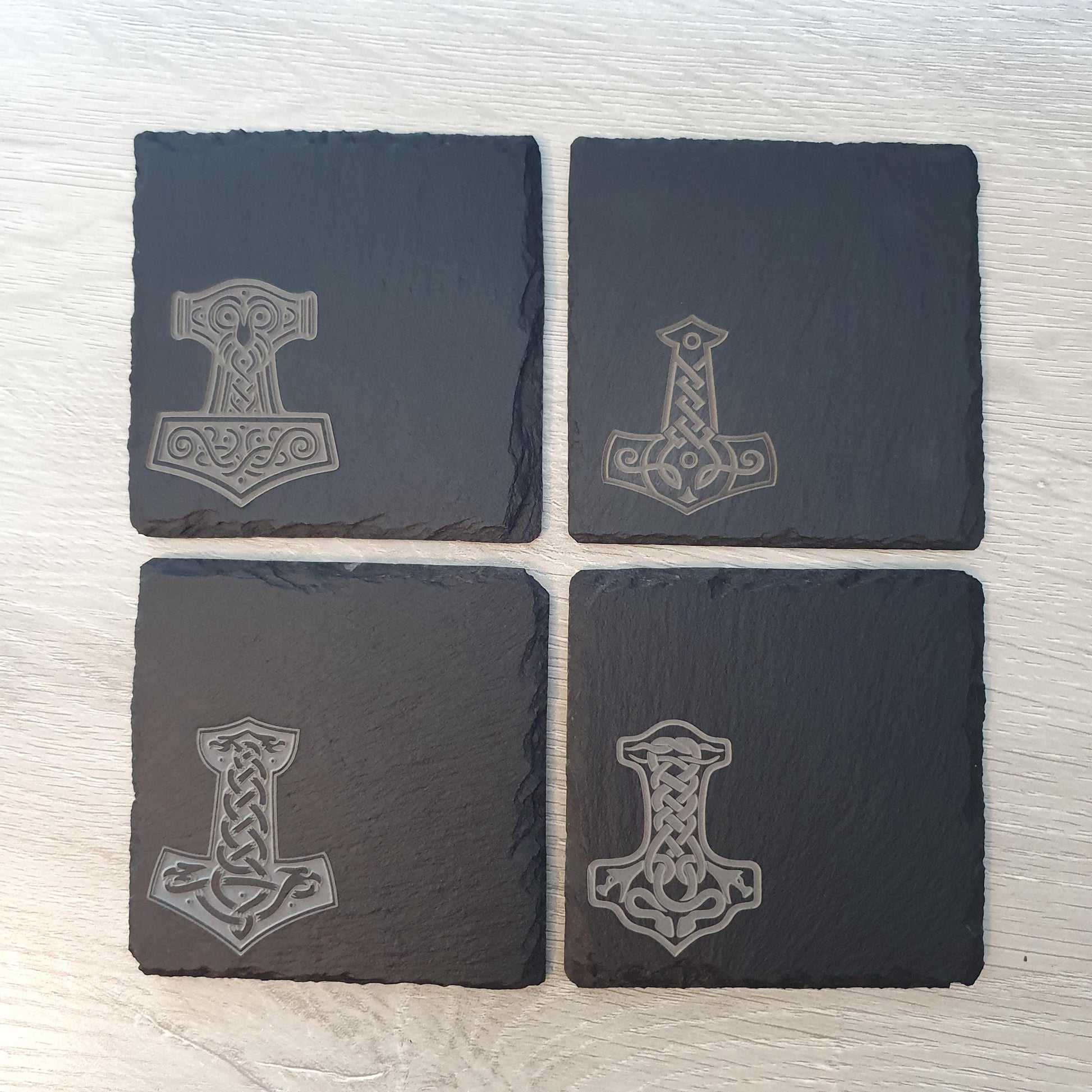 Bring the power of Norse mythology to your home with this unique set of four laser engraved slate coasters, each featuring a different design of Thor’s legendary hammer, Mjolnir. Perfect for lovers of Viking lore, these coasters are more than just functional – they’re a bold statement piece for any table.