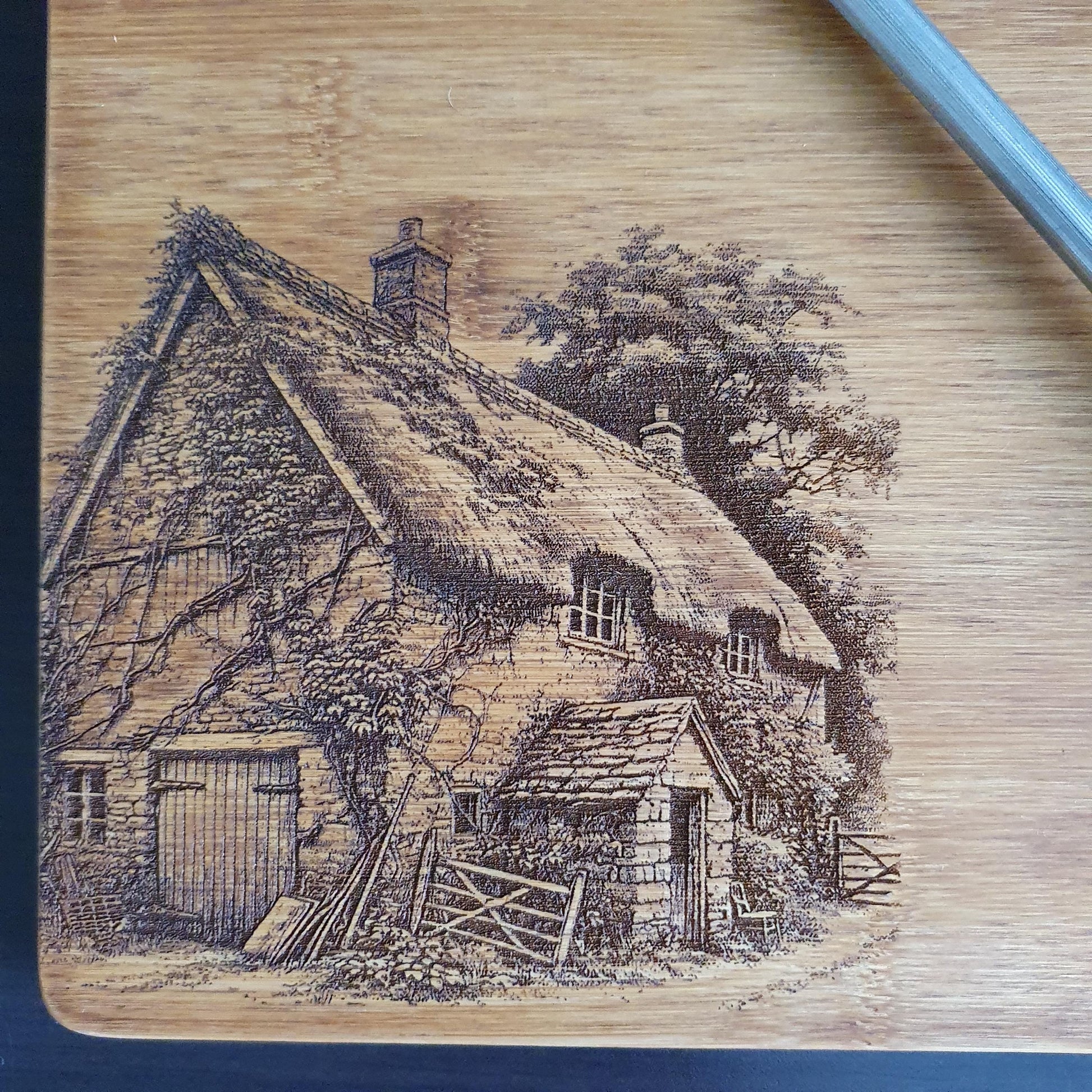 Bring the charm of the countryside into your kitchen with this beautifully aged bamboo chopping board, featuring an intricate laser-engraved etching of a weathered, old farmhouse. The highly detailed design captures the essence of rustic life—crumbling walls, sagging rooflines, and the timeless beauty of rural architecture—making it a truly unique piece for your home or a thoughtful gift for farmhouse enthusiasts and lovers of rustic decor.