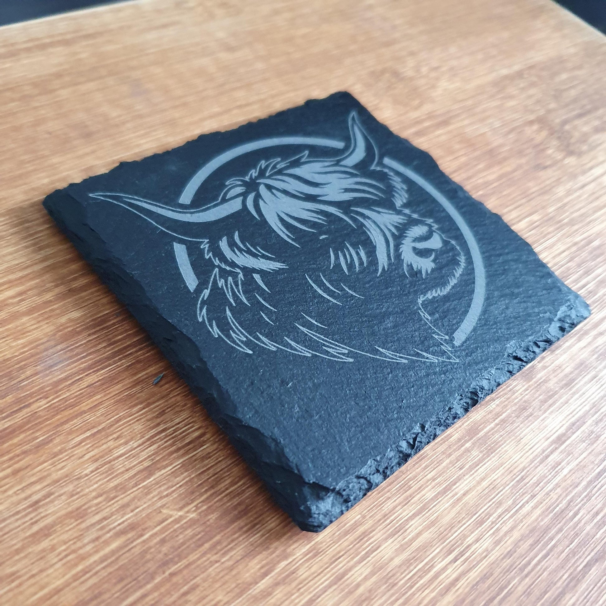 Bring a bold touch of the Highlands into your home with this beautifully crafted slate coaster, featuring a modern portrait-style engraving of a Highland cow. With its signature shaggy coat and striking horns, this beloved symbol of Scotland is captured in clean, contemporary line work—perfect for rustic, country, or modern farmhouse decor.