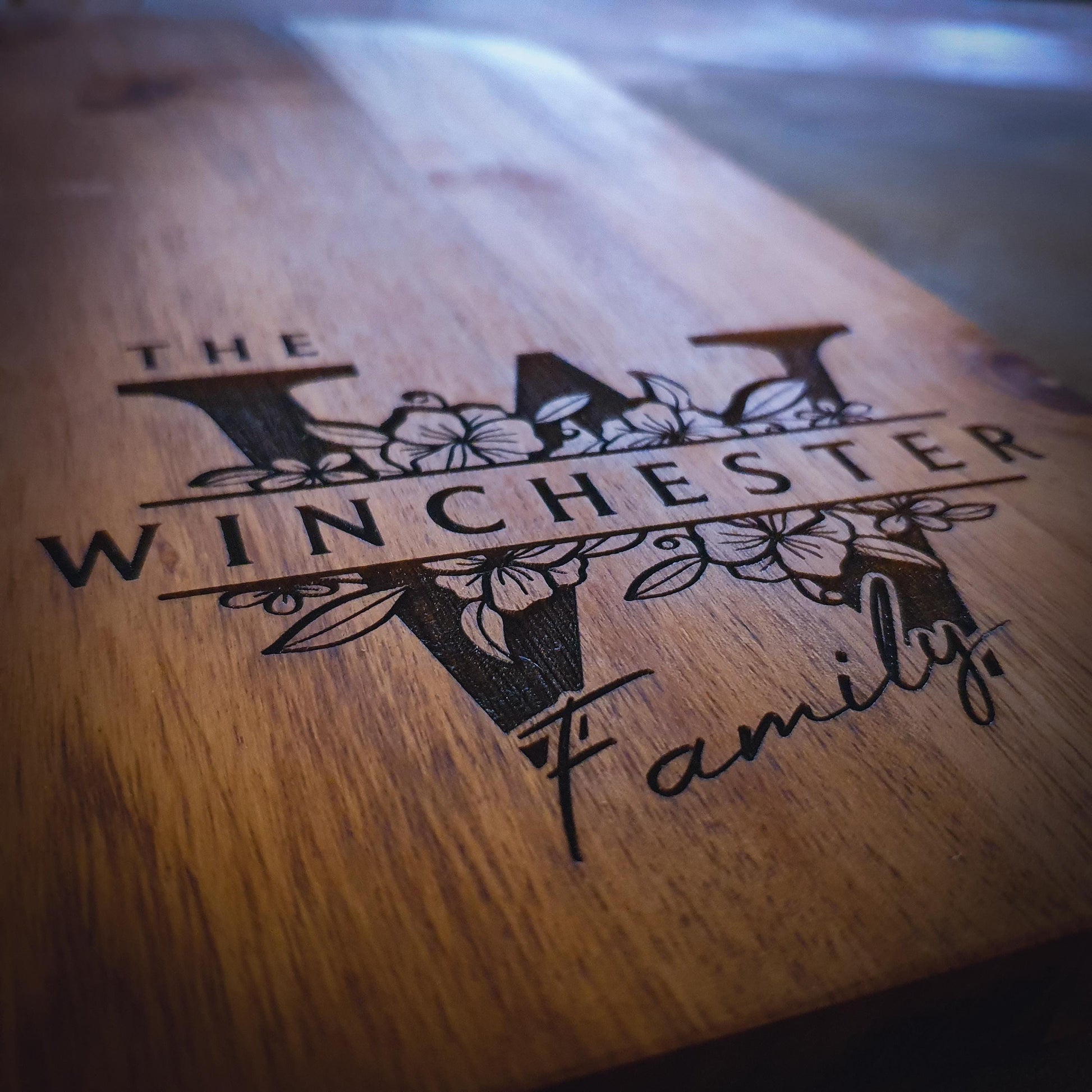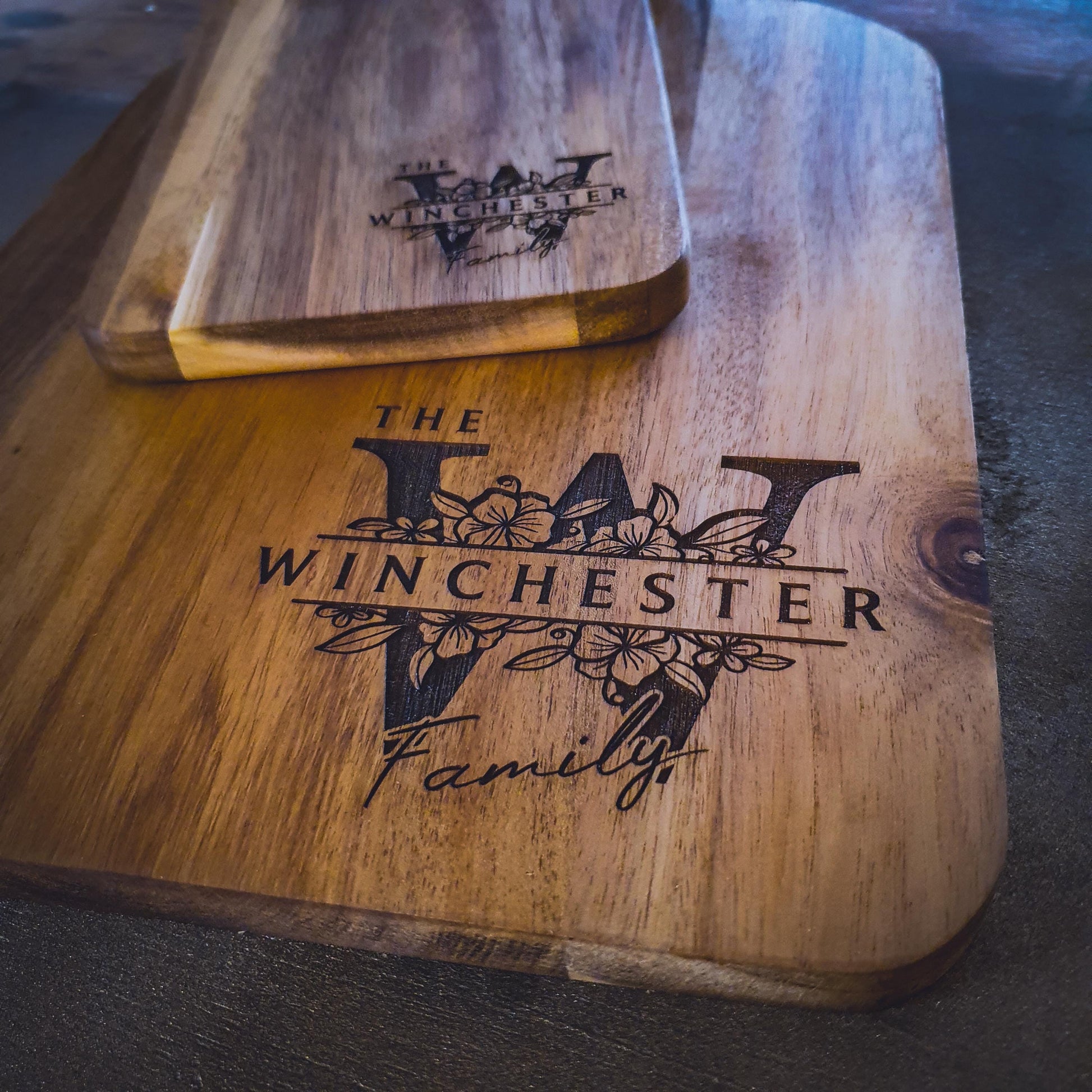 Celebrate love and meaningful moments with this beautifully engraved personalised Acacia serving board, featuring the family surname engraved in a beautiful floral split monogram.