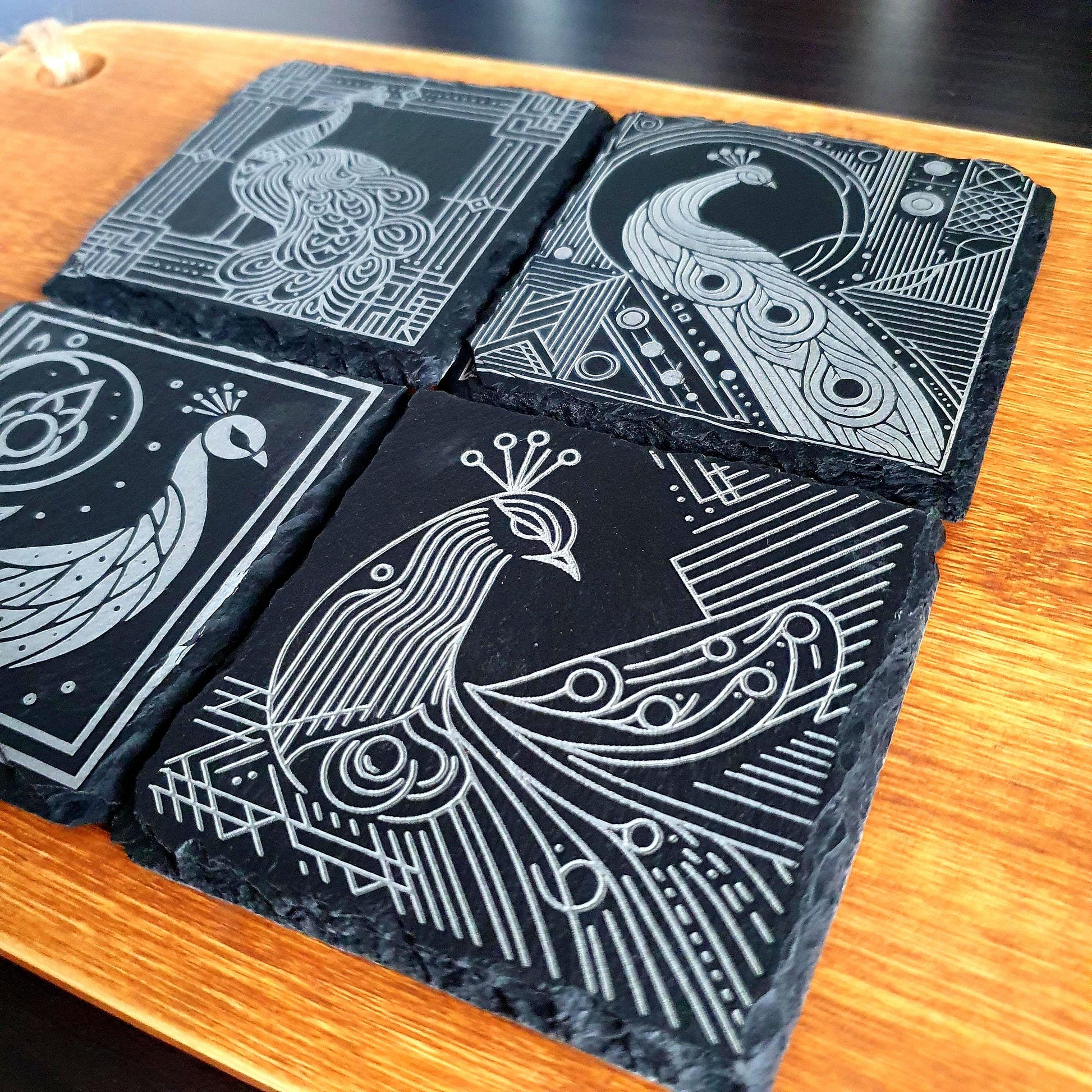 Each coaster is precision engraved into natural slate, with a different geometric interpretation of the iconic peacock. The sharp, clean lines of the design contrast beautifully with the organic texture of the slate, creating a striking and contemporary look that suits both modern and eclectic interiors.