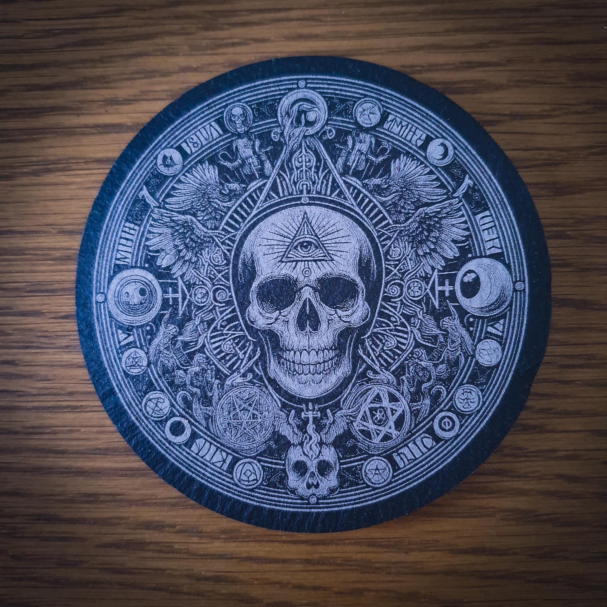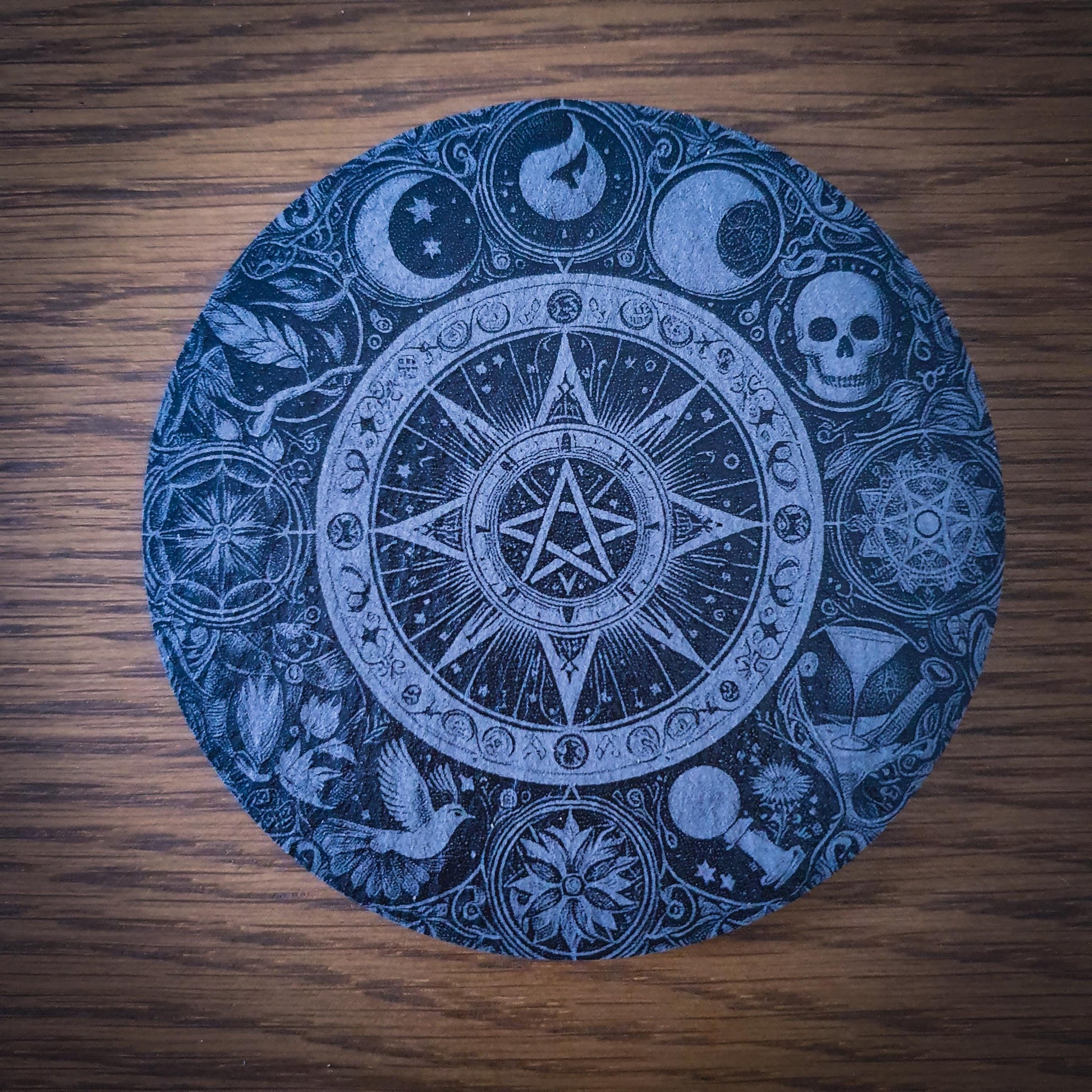 Set of 6 Occult Slate Coasters – Gothic Home Decor | Halloween Gift | Laser Engraved 100mm Round Slate